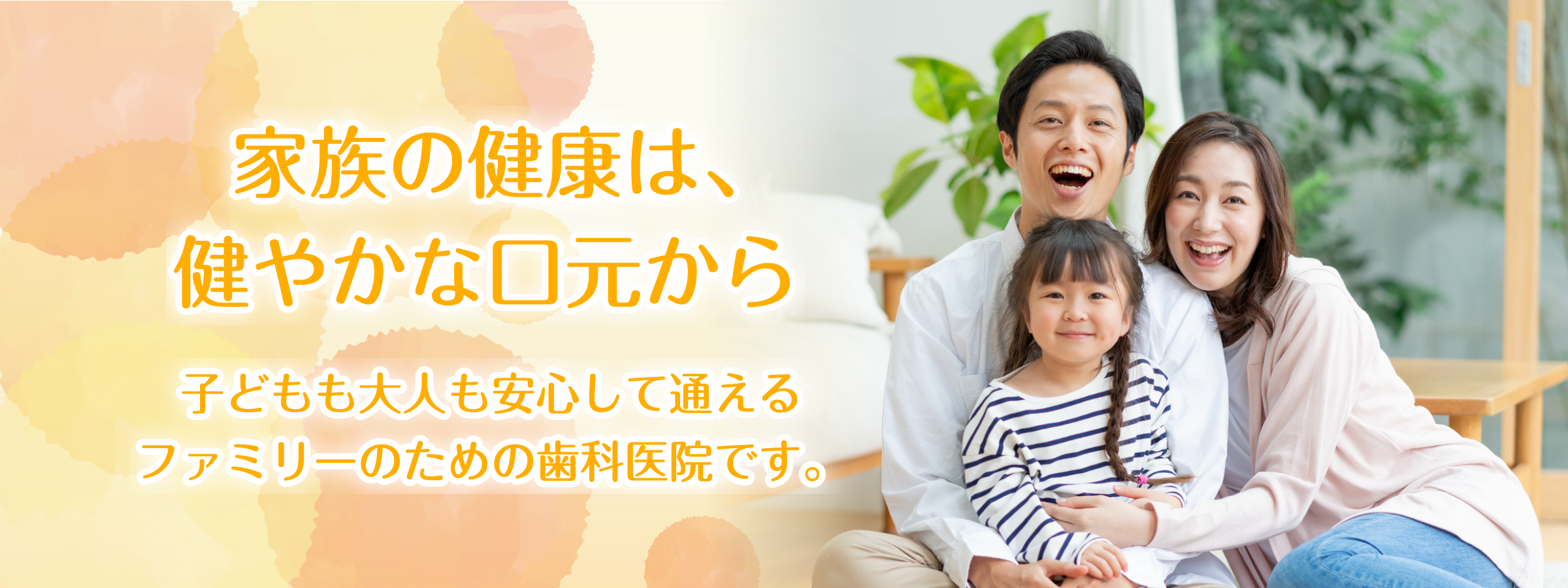 当院の診療科は一般歯科から小児歯科、訪問診療と幅広く、お子さまから成人の方、そしてご高齢の方まで、ご家族で通える歯科医院です。