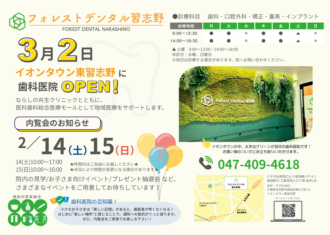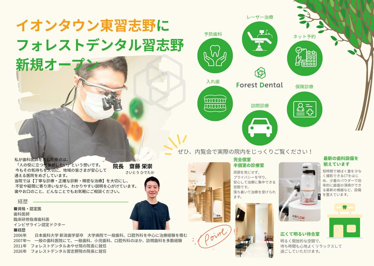内覧会を行うのは、新しく開院する医院の存在を地域の方に知ってほしいという想いからです。なかなか見られない医院の内部をご覧になり、当院を知っていただくことで、安心して通院できるのではないでしょうか。医院の取り組みや考えをひとりでも多くの方に知ってもらい、歯科を身近に感じるきっかけになればと思います。